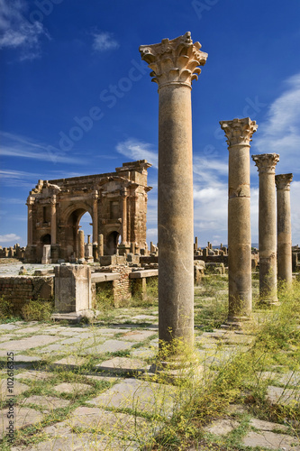 Fototapeta premium Algeria. Timgad (ancient Thamugadi or Thamugas). View on Trajan's Arch via...