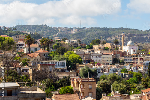 Fototapeta premium Algiers, Alger, Algeria, 04 10 2023 : Panoramic view of the northern districts of Algiers. Houses, mosque, green hill.