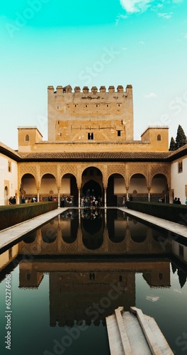 Fototapeta premium Alhambra Palace in Granada, Spain with tourists' reflection on water