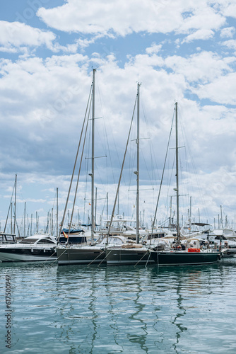 Fototapeta premium Alicante, Spain - May 16, 2023: Summer Costa Blanca, Alicante - modern yachts, boats moored in the city marina. Trip concept. popular Spanish city. part of the city center