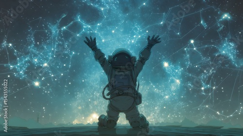 © vanilnilnilla, Fototapeta premium Alien astronaut celebrates cosmic golf hole in one in starry landscape