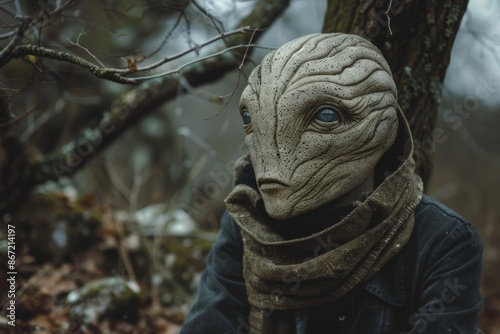 © Yuliia, Obraz premium Alien humanoid with a smooth headscarf looking introspectively in the woods