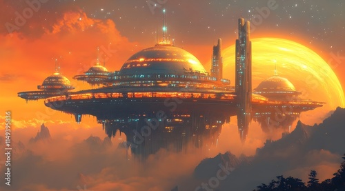 Fototapeta premium Alien Observatory on Vibrant Gas Giant's Rings bathed in Ethereal Glow -...