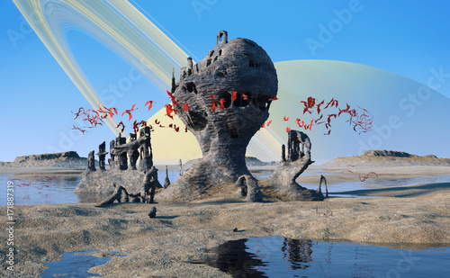 Obraz premium alien planet landscape, flying red creatures swarming around mysterious rock...