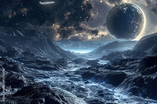 © chesleatsz, Fototapeta premium Alien Planet Landscape with Spaceships and Galaxies. Breathtaking Sci-Fi Scene
