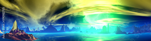 Fototapeta premium Alien Planet. Mountain and lake. Panorama. 3D rendering