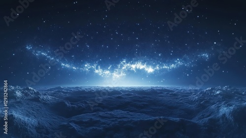 Fototapeta premium Alien planet sunrise, starry sky, cloudscape, fantasy landscape, science fiction