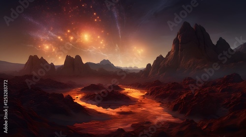 © cynz, Fototapeta premium Alien planet with strange rock formations, glowing rivers of lava, and an eerie sky filled with unfamiliar celestial bodies, otherworldly and awe-inspiring