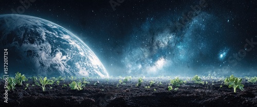 Fototapeta premium Alien planet, young plants, Earth, starry sky