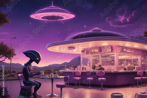 © dex, Fototapeta premium Alien Sipping Coffee At A 1950s-Style Diner, With A Jukebox Playing And Their Flying Saucer Parked Outside Under A Glowing Purple Sky