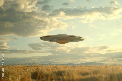 © Isuru, Obraz premium Alien UFO hovering over field humanoid spaceship extraterrestrial life