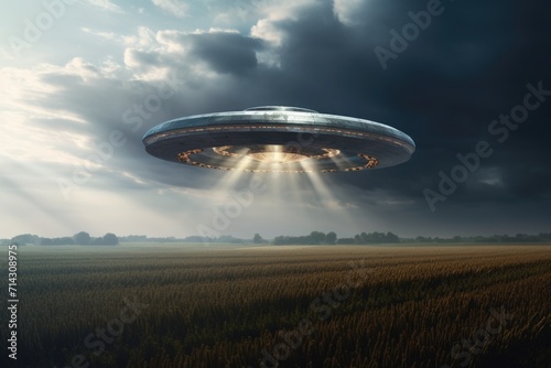 Fototapeta premium Alien UFO hovers motionless in sky.