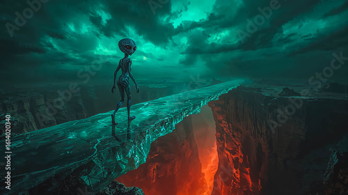 Obraz premium Alien Walking on a Transparent Bridge Over a Chasm