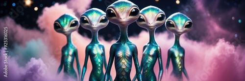 © MonkeyART, Naklejka premium aliens with large eyes and slender bodies standing together against a cosmic background. Copy space template web site banner
