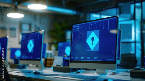 Fototapeta premium All office computers display a blue screen with a large warning sign, indicating a widespread system error or malfunction.
