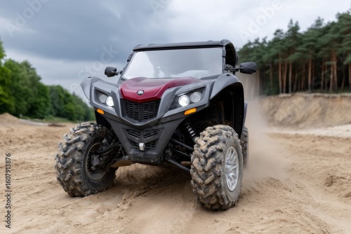 Fototapeta premium All-terrain buggy navigating sandy terrain amidst dense forest