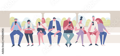 Fototapeta premium All the passengers on the subway are looking at their cell phones. vector...