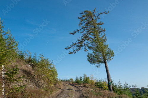 Obraz premium Alleinstehende Kiefer vom Wind gebogen am Wegesrand