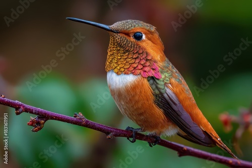 © Ifti Digital, Fototapeta premium Allens hummingbird perched on branch showcasing vibrant feathers in natural environment during the afternoon light in a tranquil garden
