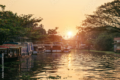 © gilitukha, Fototapeta premium Alleppey backwaters with local boat on sunrise