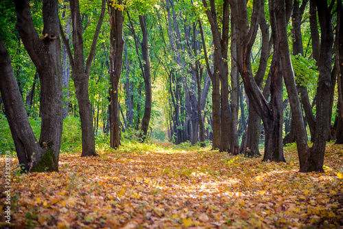 © Sergiy Bykhunenko, Obraz premium Alley on the autumn forest with falling leaves
