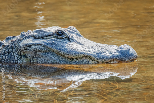 © Tom Olson Photo, Obraz premium Alligator closeup in the Florida Everglades reflection in the water.