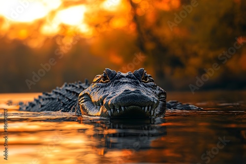 © donchanu, Obraz premium Alligator in Water at Sunset