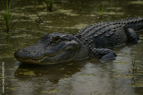 Obraz premium Alligator partially submerged in murky, green-brown water