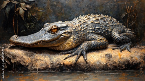 Fototapeta premium Alligator resting museum exhibit swamp background