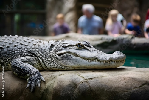 © Jawed Gfx, Fototapeta premium Alligator rests peacefully in zoo enclosure, observed by visitors