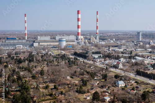 Obraz premium Allotment gardens over Lake Czerniakowskie and chimneys of Sieierki Power...