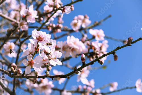 Obraz premium Almond tree in bloom. Spring flowers, Blossoming spring almond tree flowers on blue sky background, Copy Space.