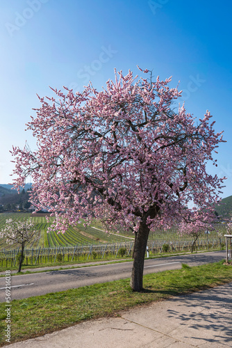 Fototapeta premium Almond tree in full bloom on a sunny spring day in Rheinhessen/Germany