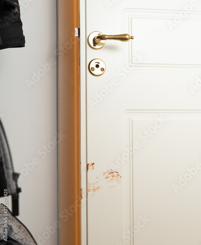 © Trygve, Obraz premium Almost closed bathroom door with a chocolate hand mark from a child.