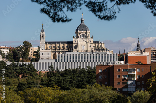 Obraz premium Almudena Cathedral and the Royal Palace of Madrid seen from the other side of...