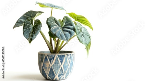© Imsuniyah, Fototapeta premium Alocasia plant with large, dark green leaves in a blue and white patterned pot