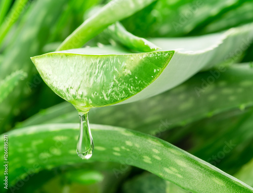 © volff, Fototapeta premium Aloe gel dropping from fresh aloe vera leaf cut. Aloe Vera plant at the background.