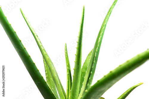 Obraz premium Aloe Vera leaf closeup on white background.