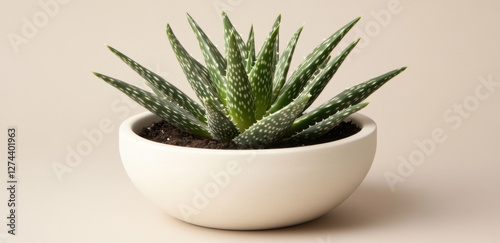 Fototapeta premium Aloe vera plant displays vibrant green leaves with distinctive markings, nestled in a smooth white pot on a calm surface