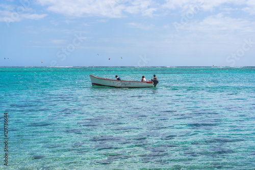 Fototapeta premium Alone boat on Idyllic beach on the coast of Mauritius