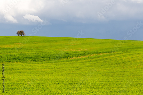 © ververidis, Fototapeta premium Alone tree on green wheat field on blue sky background