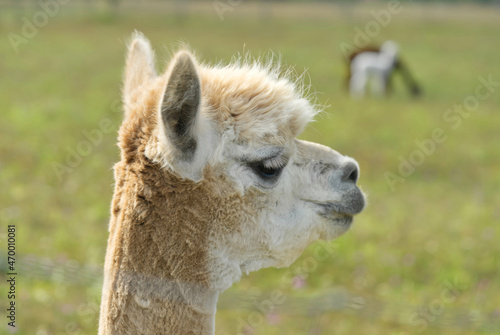 © valeri, Obraz premium Alpaca Animal Close Up Of Head Funny Hair Cut And Chewing Action. farm