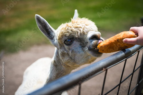 Naklejka premium Alpaca being fed on a farm, farmyard animal experience