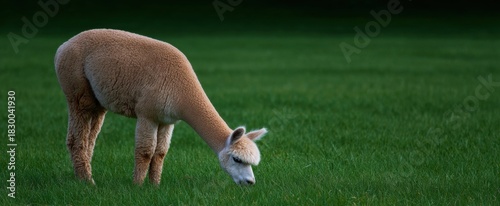© ckybe, Obraz premium Alpaca calmly grazes in a lush green pasture field.