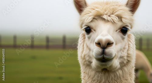 Fototapeta premium Alpaca chews hay while standing in open field with gentle breeze and greenery...