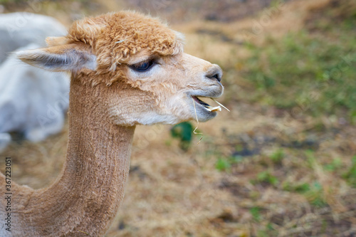 © Arthur, Obraz premium Alpaca close up portrait with blurred background. Copy space.