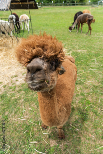Fototapeta premium Alpaca funny face close up portrait, with funny hair cut in outdoor ranch