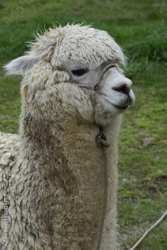 © Андрей Поторочин, Obraz premium Alpaca grazes on the territory Inca prehistoric ruins in Chucuito near Puno, Titicaca lake area. Peru