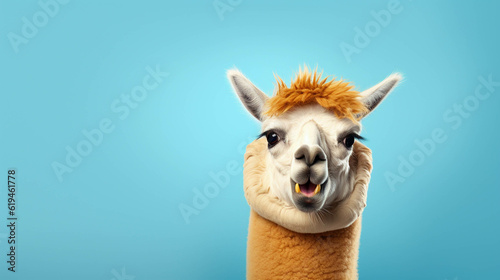 © s1llu, Fototapeta premium Alpaca Looking at the Camera. Solid color background with empty space for text. Web Banner template. Generative AI