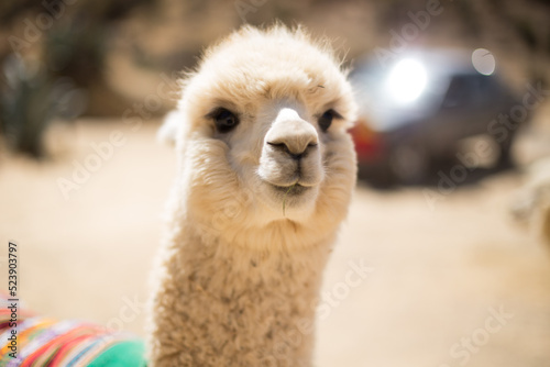 Obraz premium Alpaca mirando a la cámara en un parque recreacional de Perú. Concepto de...